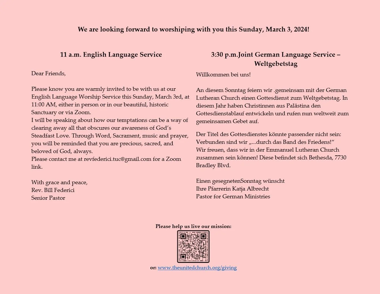 Please know you are warmly invited to be with us at our English Language Worship Service this Sunday, February 25TH, at 11:00 AM, either in person or in our beautiful, historic Sanctuary or via Zoom.