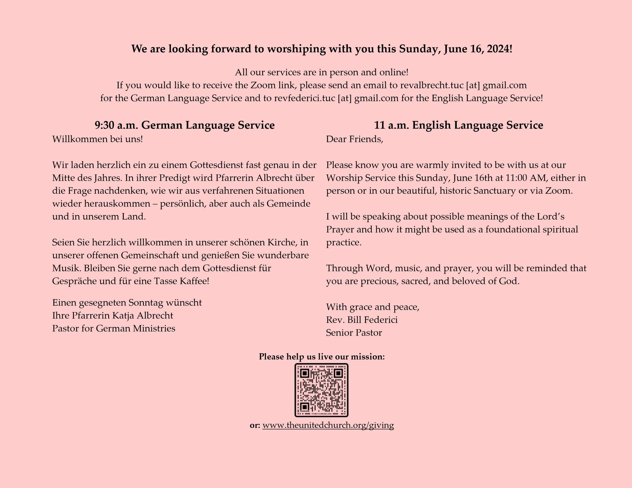 Please know you are warmly invited to be with us at our Worship Service this Sunday, June 9th at 11:00 AM, either in person or in