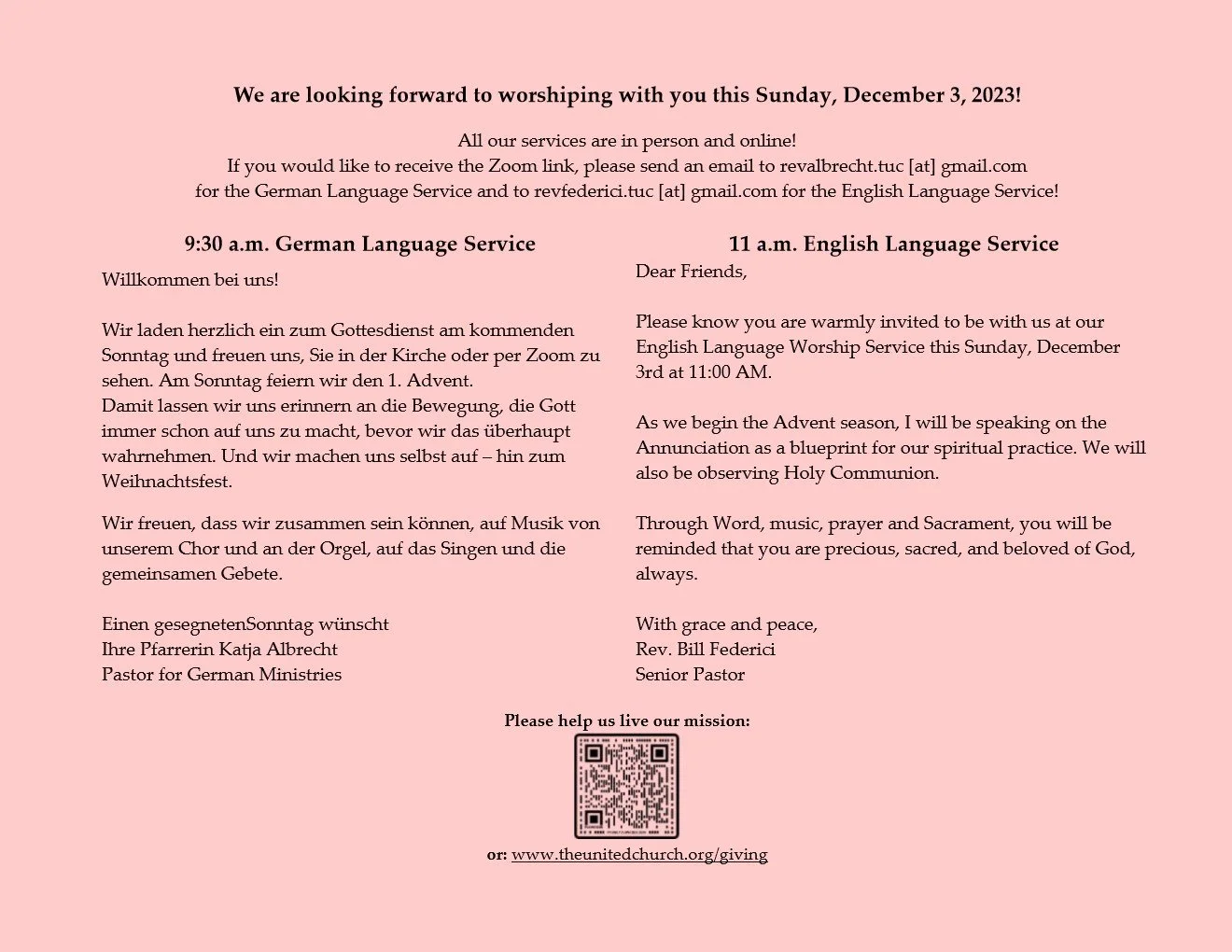 Please know you are warmly invited to be with us at our English Language Worship Service this Sunday, December 17th at 11:00