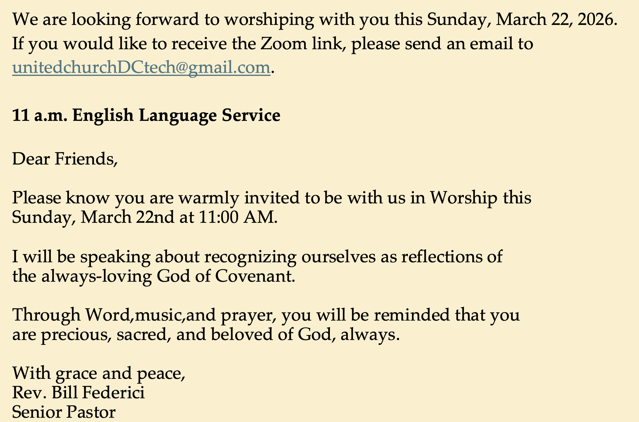 - Mar 15, 2026 Deutschsprachiger Gottesdienst (German Service) In Person and Zoom Mar 15, 2026