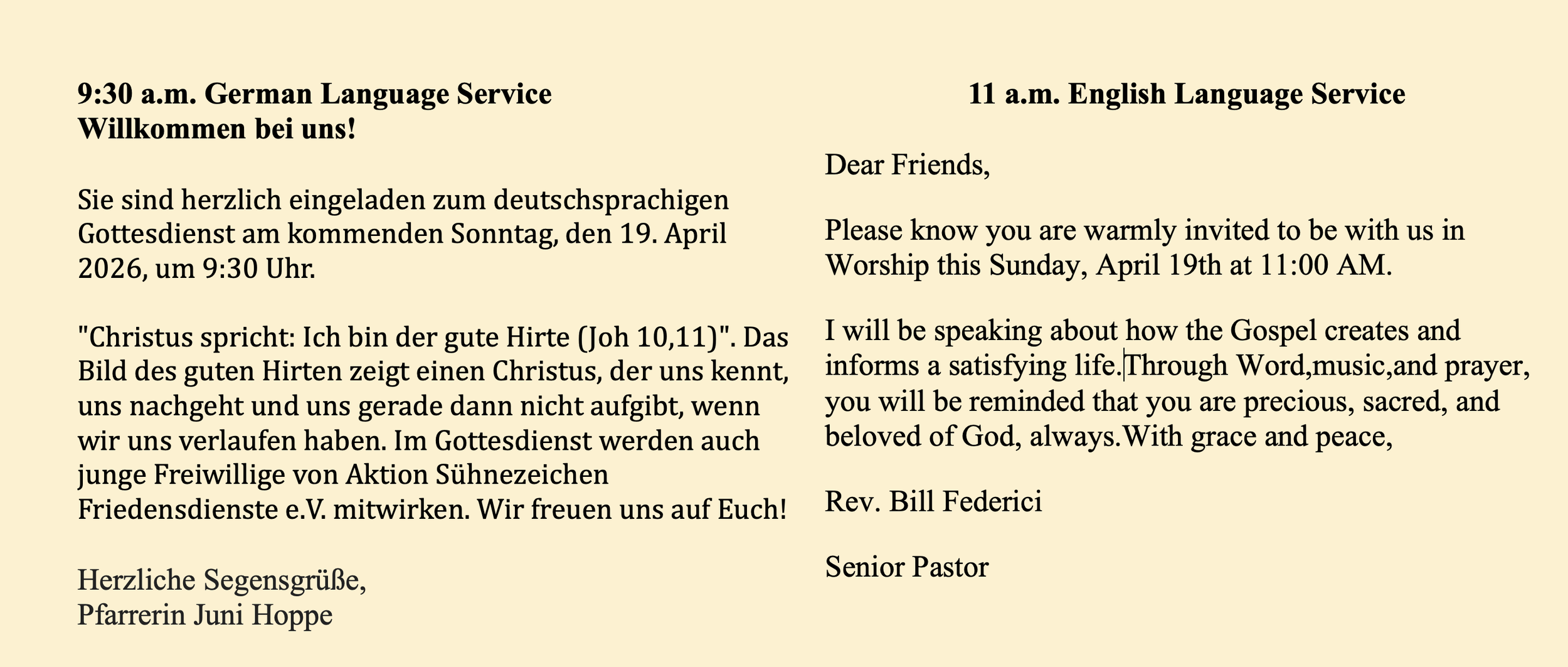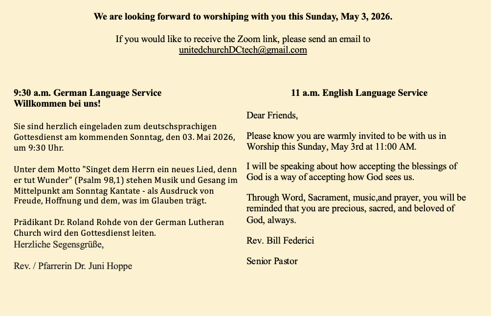 - May 3, 2026 Deutschsprachiger Gottesdienst (German Service) In Person and Zoom May 3, 2026