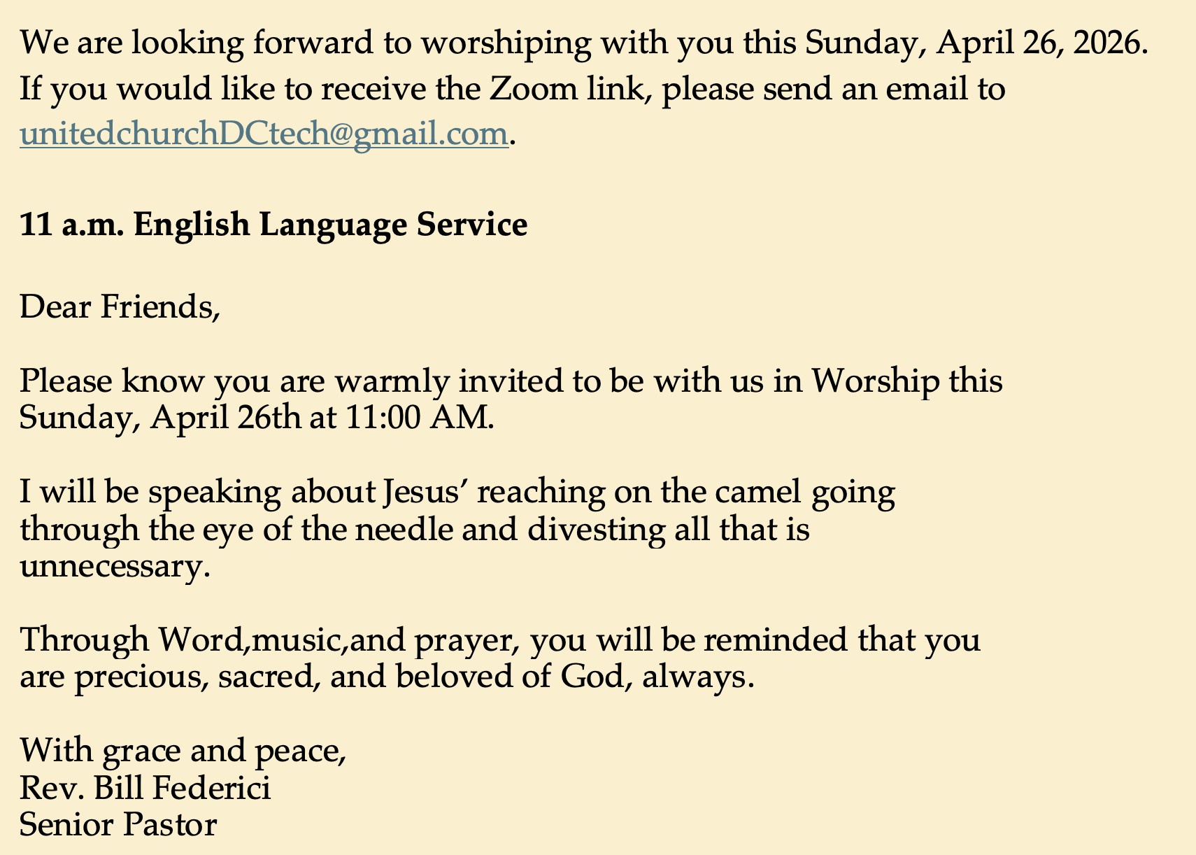 - Dec 21, 2025 English Service (in person and on Zoom) Dec 21, 2025